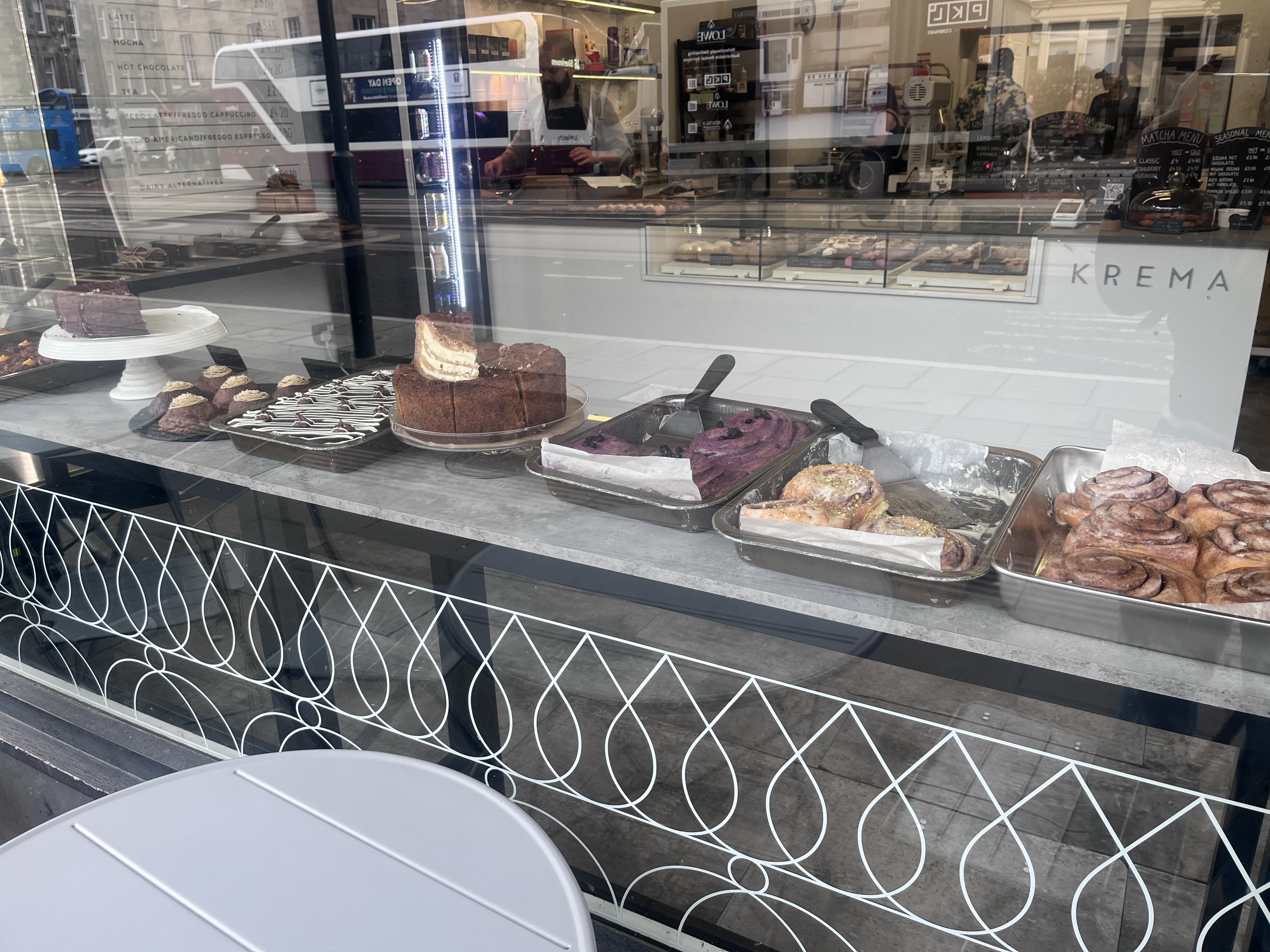 Now onto my chat with the owner: Theo (full name Theodoris) opened the bakery in March of 2022. He has been in Edinburgh for twelve and a half years, and as well as owning the bakery, he is also a personal trainer. Coming from Greece, he had another shop with his family and was inspired to open KREMA after he couldn’t find somewhere in Edinburgh that hit his taste buds. He came up with the idea around COVID, and once everything started opening up, he decided to make his move, seeing the location at the bottom of Leith, with the big windows and high ceiling, he said he told his agent, “I don’t know what it’s going to take, just get me that shop,” telling me he could already “envision how it would look” as soon as he saw the location. Like every local business, it’s had its difficulties while opening, most notably the construction of the trams on Leith Walk. With large noises coming from the construction and gates hiding the location, the business felt an effect. They also make wedding cakes and do wholesale, and he told me one difficulty was getting taxis/transportation for their goods because the construction blocked off most of the area. Another difficulty for them was the lingering effects from lockdown, with him telling me the reason the shop doesn’t have indoor seating was the fear of another lockdown or a need for social distancing. But now the shop has developed on from these difficulties, with the tram works complete, they now have seating available outdoors, and no indoor seating almost adds to the location as they have such a unique look with the bakery on display. For the future, Theo told me he looks to expand on the wholesale/wedding cakes the shop offers, but also if all goes well, they are looking into the possibility of opening a second location somewhere in Edinburgh.
