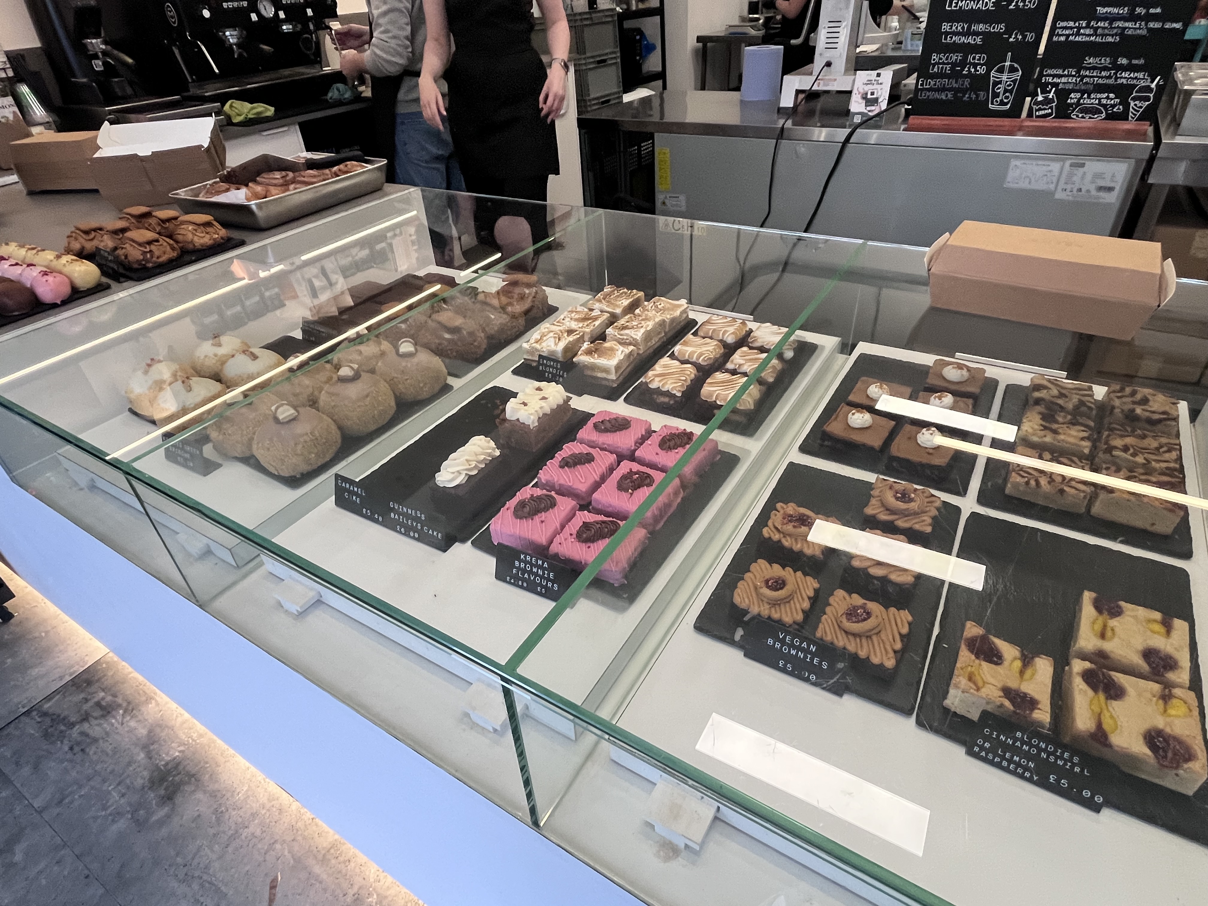 Located at the bottom of Leith Walk, the location is perfect for you Leithers. The shop’s large glass window has a selection of their baked goods on display, accompanied by the fantastic smell coming from the shop; it’s hard to resist popping in while walking by. Walking in, you are met with a glass counter with even more items on display, as well as a firsthand look at the goods in the window. They also have various glass displays with more cakes, pies, cookies, and pretty much anything sweet you can think of. In the background of the shop, you can see where the magic happens; pretty much their whole bakery is on display, offering a very unique look into how they operate. They have limited seating available with two tables located just out the front.
