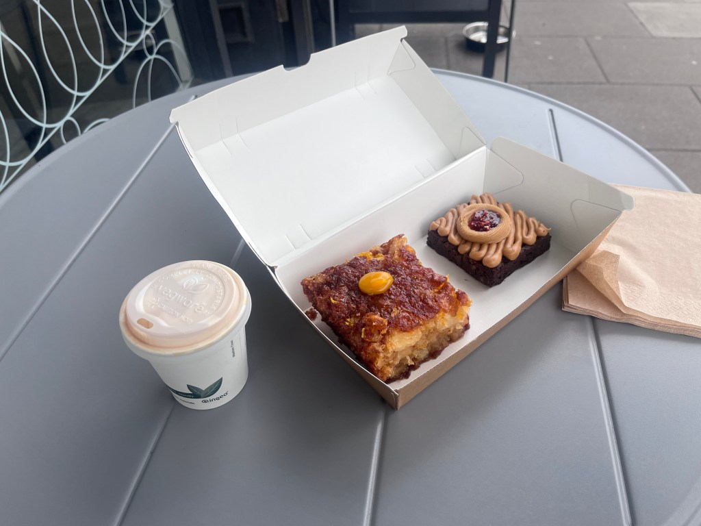 The bestsellers at the shop are their selections of buns they offer, but also Theo’s personal favourite item, their orange pies. A traditional Greek pie, he uses his mother’s recipe to bring a unique taste of Greece to Leith. I decided to grab a slice of the orange pie, a vegan peanut butter and jam brownie, and to drink a cortado.